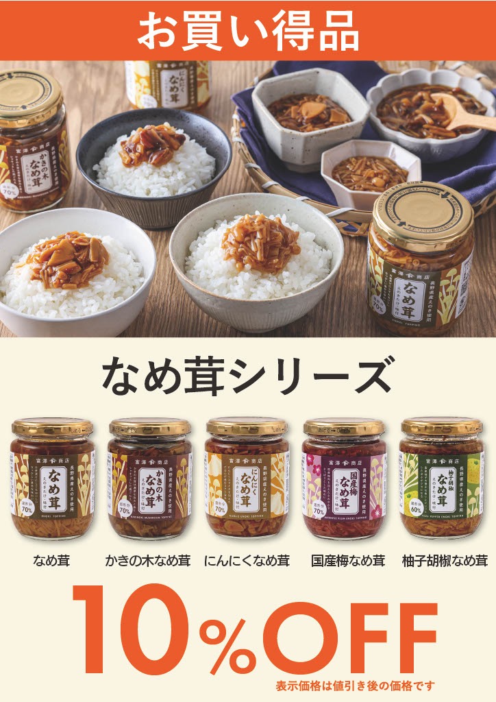 ご飯が進むなめ茸シリーズを、オープニング期間中10%OFFにて販売。