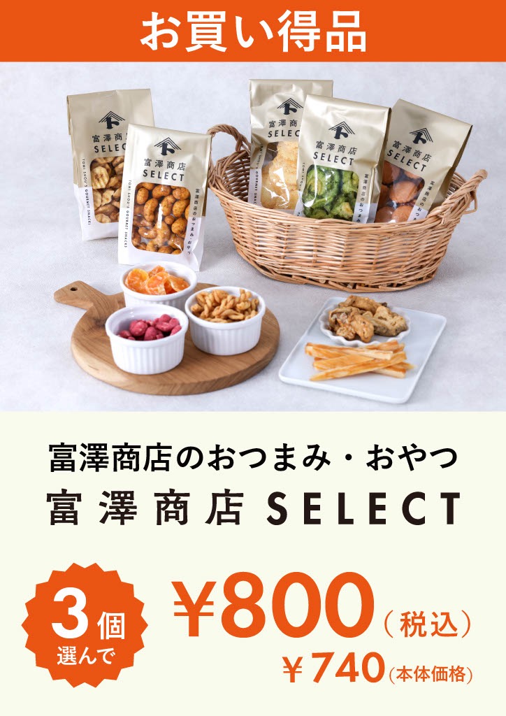 おつまみやおやつにぴったりで、食べきりやすく手に取りやすい「富澤商店SELECT」シリーズの中から好きな3個を選んで特別価格800円で販売!