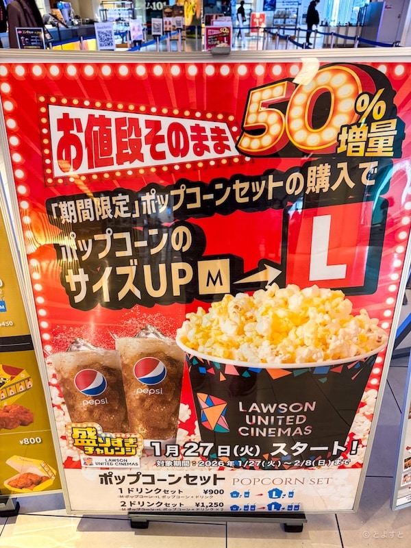 ポップコーンとドリンクのセットをオーダーした際に、ポップコーンがMサイズからLサイズへと増量!