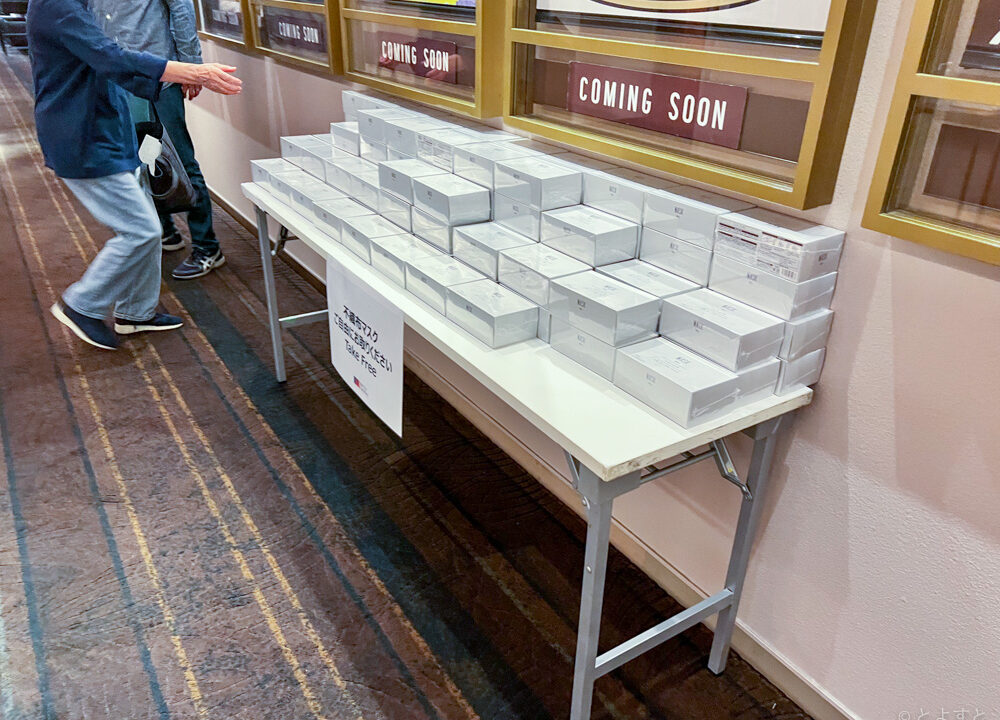 (2022年6月10日 20時ごろの様子)なんと、山積みにされた箱入りのマスクがスクリーン前にド~ンと置かれているではありませんか!不織布のマスクです。