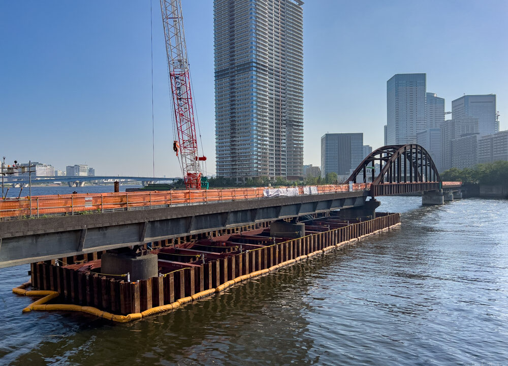 この記事を書いている2022年7月現在は、旧晴海鉄道橋の豊洲側に位地する橋脚の補強を本格化するところ。