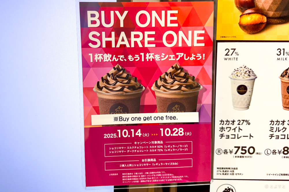 ゴディバはショコリキサーを販売している「ゴディバ」の店舗で、「ショコリキサー BUY ONE SHARE ONE キャンペーン」を実施しています。