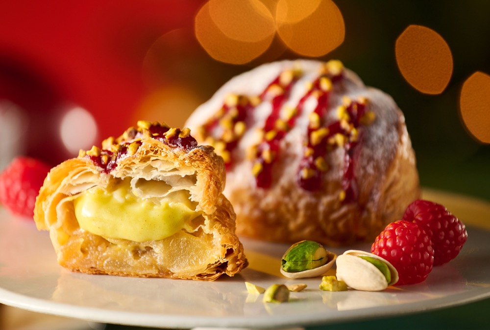(焼きたてカスタードアップルパイ〈ピスタチオベリー〉)ピスタチオペースト入りのなめらかなカスタードクリームがたっぷりと注ぎ込まれた、ホリデーを華やかに彩るアップルパイがこちら。
