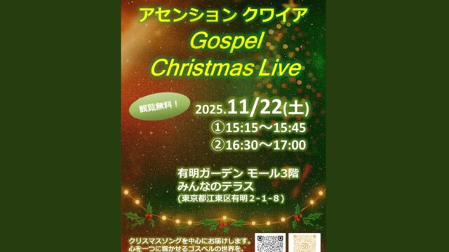 イベント 観覧無料!有明ガーデンで、ゴスペルLIVEが開催へ(11月22日) 2025年11月21日 とよすと https://toyosu.tokyo/wp-content/uploads/2024/04/toyosuto10th_325-75.jpg とよすと – 毎日更新!豊洲エリアの今がわかる地域情報サイト