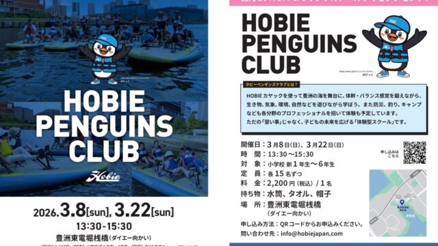 イベント 豊洲の水辺で学ぶ新しいキッズスクール「HOBIE PENGUINS CLUB」、体験イベントを開催! 2026年3月5日 とよすと https://toyosu.tokyo/wp-content/uploads/2024/04/toyosuto10th_325-75.jpg とよすと – 毎日更新!豊洲エリアの今がわかる地域情報サイト